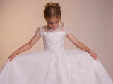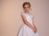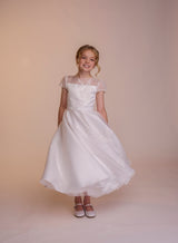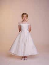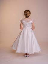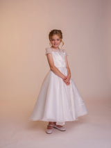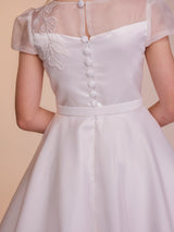 The Fallyn dress is a statement piece. A large floral embroidery motif decorates the front of this dress, focused on the left side of the gown the detail ascends to cover the bodice and falls over the shoulder. With a full circle skirt layered under a beautiful silk organza fabric, the supreme satin bodice of this dress creates a soft contrast to the silk organza fabric, which is then reintroduced in the dress’ neckline and sleeves. The bodice features seams in a V formation that meet the waistline in perfect harmony with the dress’ belt. Complete with complimentary buttons on the back to meet the dress’ waistline.