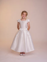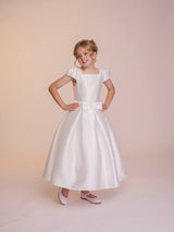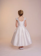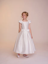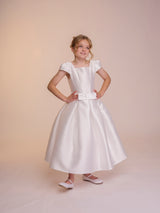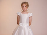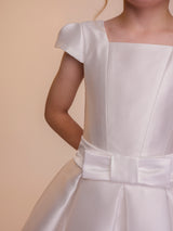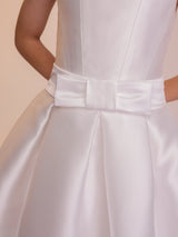 The Lucia dress is a showstopper. With a drop waist and full box pleat skirt, this dress is sure to turn heads. Made from a stunning white silk blend mikado this dress holds structure and is sure to sit beautifully throughout your day. A square neckline with structured cap sleeves compliment the drama of the skirt with a satin waistband and bow to complete the look.