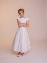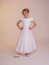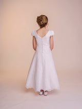 The Poppy dress features a softer skirt and beautiful boat neckline. Both sides of the skirts are covered in gorgeous corded lace panels that create an almost basque effect on the luxury crepe skirt, complete with cap sleeve, finished with a matching lace trim. The back of the dress features a v back complete with buttons running down the back seam until they meet the lace.