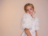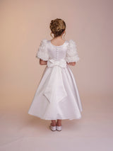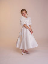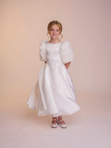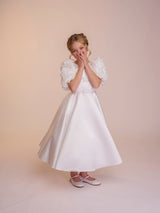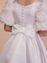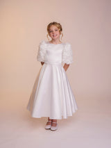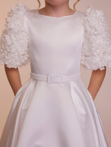 The Rosie dress is all about the sleeves. Featuring beautiful oversized floral textured sleeves, this dress will be sure to turn heads. With a full supreme satin skirt and bodice, the Rosie dress is completed with a matching belt. The back of the dress features a long modern bow at the base of a row of matching fabric covered buttons.