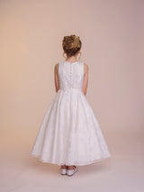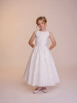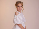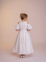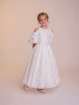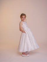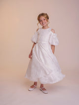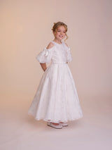 The Tess dress is made with the most fabulous floral devoré fabric. A true statement dress, that is so much fun. The off the shoulder puff sleeves feature a beautiful contrasting satin bow which really give the dress a youthful feel. These sleeves are made detachable so can be taken off throughout the day. The full circle skirt features pockets and the fabric creates such beautiful movement. The dress is complete with a matching belt.