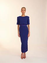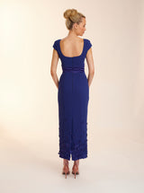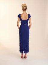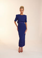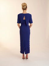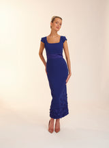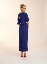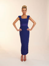 The Delilah dress is made from a beautiful royal blue heavy weight crepe. Its scooped neckline with cap sleeves gives the dress a feminine feel. It features a charming satin band below the bust which is still visible when wearing the matching cropped jacket which appears open at the back to see the scoop back. The bottom of the dress is covered in 3D flower appliqués, concentrated at the bottom of the dress and dispersing upwards.
