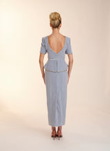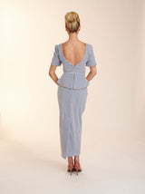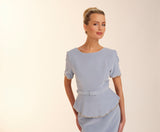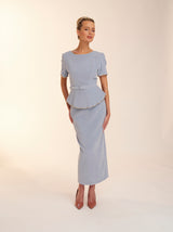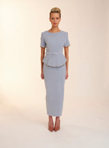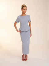 The Freya dress features a high neckline with low v back. Made from the most luxurious soft blue velvet this dress is perfect for Autumn/Winter. With it's peplum feature, finished with a straight skirt Freya exudes elegance. The peplum and sleeves on this dress are finished with an embellished scalloped edging giving the dress a fun feel.