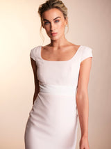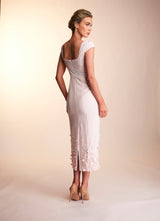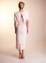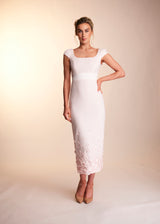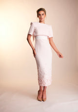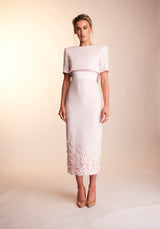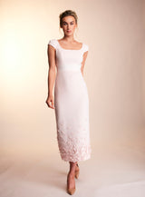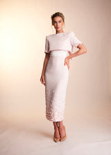 The Delilah dress is made from a beautiful light pink heavy weight crepe. Its scooped neckline with cap sleeves gives the dress a feminine feel. It features a charming satin band below the bust which is still visible when wearing the matching cropped jacket which appears open at the back to see the scoop back. The bottom of the dress is covered in 3D flower appliqués, concentrated at the bottom of the dress and dispersing upwards.