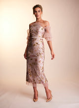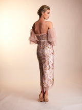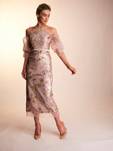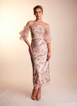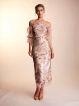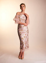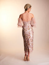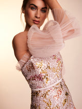 Flossy is a showstopper! This dress is made with a fully sequinned fabric overlayed on top of a beautiful pink satin. With its strapless bodice and low back Flossy is perfect for the summer. Outlined with a tulle trim at the bust and hem of its straight skirt Flossy has matching detached sleeves in that same tulle fabric giving the dress a youthful and fun feel.