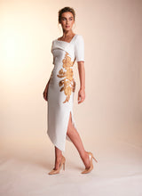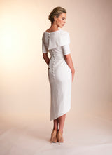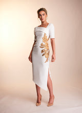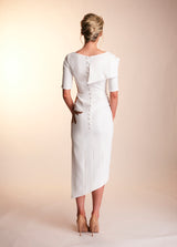 The Gisele dress is made from a heavy weight ivory crepe. The angular neckline gives a beautiful structural silhouette that pairs beautifully with its asymmetric hemline. A large floral motif adorns the side of this dress, making it ideal for summer! This dress is finished with matching crepe covered buttons.