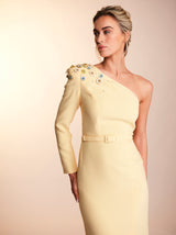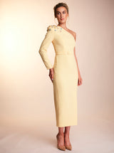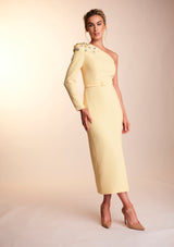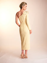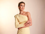 The Harper dress is made from a heavy weight crepe in a beautiful bright lemon shade perfect for the summer! This fully embellished one shoulder dress features gold rim buttons down the back and a front side slit, giving the dress a fun feel.