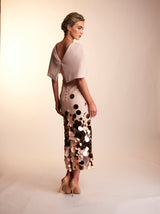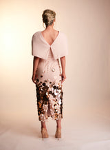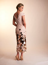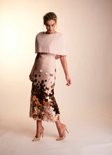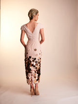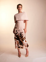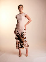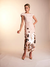 The Lottie dress is made with a heavy weight nude blush crepe, and the skirt is overlayed with a light layer of tulle, adorned with gold tonal discs. The straight skirt with a high square neck, V back and structured cap sleeves, make for an elegant shape perfect for that special occasion. Finished with matching belt and crepe covered button.