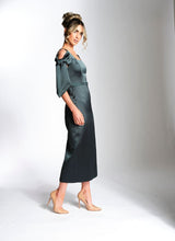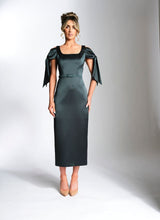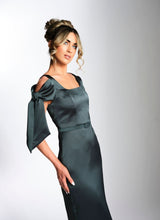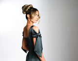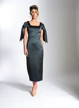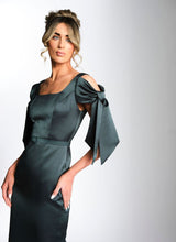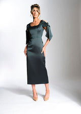 The Beau dress is made from a forest green satin. Featuring a scoop neck and back, and a fitted straight skirt the elegance and simplicity of this dress make it a beautiful choice for the any season. A large bow sits across the arms providing a bit of coverage of the arms whilst still allowing for plenty of movement.