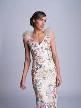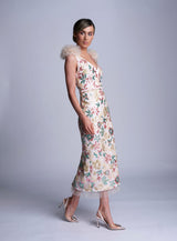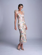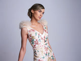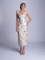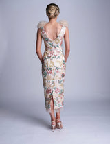 The Carrie dress is made from an all over floral sequined tulle with a soft pink satin underlay. Featuring a v-neck and back and fitted straight skirt the elegant shape of dress accentuates and flatters the figure. Layered tulle adorns the shoulders adding shape and volume to the dress. The hem is finished with the same tulle gathered along the bottom. The Carrie dress is fun and vibrant and perfect for that special occasion. The dress is finished with a fabric covered belt.
