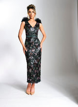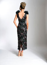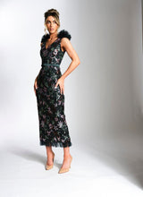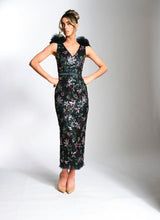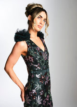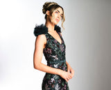 The Carrie dress is made from an all over floral sequined tulle with a forest green satin underlay. Featuring a v-neck and back and fitted straight skirt the elegant shape of dress accentuates and flatters the figure. Layered tulle adorns the shoulders adding shape and volume to the dress. The hem is finished with the same tulle gathered along the bottom. The Carrie dress is fun and vibrant and perfect for that special occasion. The dress is finished with a fabric covered belt.