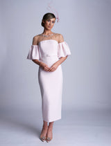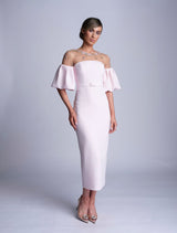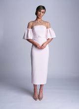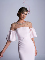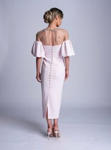 The Charlotte dress is made from a heavy weight soft pink crepe. The top of the bodice is a gold lace with nude tulle underlay adorned with soft pink, blue and gold floral applique. The beaded detail is so luxurious and perfect for that special occasion. The sleeves are fitted over the shoulder and then puff out in the crepe to finish. The dress is completed with a fabric covered belt and fabric covered buttons.