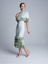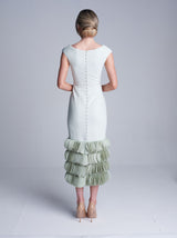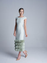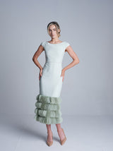Made from a beautiful green crepe the Mae dress features a boatneck neckline and capped sleeve. The skirt is fitted over the hips to flatter the figure with a beautiful and unique silk chiffon circle fabric finishing the hem. The dress is finished with covered buttons and embellished belt.