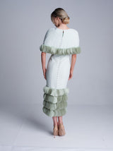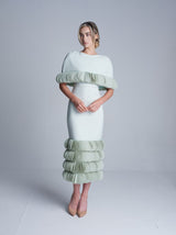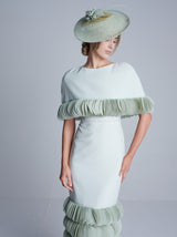 The Mae cape is made from the same green crepe, trimmed with the same circular embellishment as the dress and finished with covered buttons. The embellishment balances the shape of the cape with the shape of the dress and exudes elegance. Cape sold separately.
