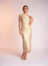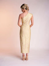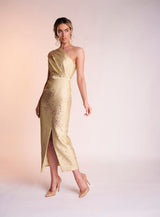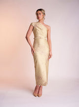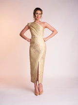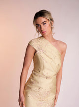 The Amber dress is made from the most beautiful yellow and metallic jacquard material. It features the most stunning one shoulder neckline with a front slide split on the dress’ skirt to create balance. Complete with a matching belt, Amber is perfect for that special occasion.