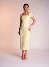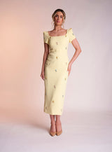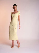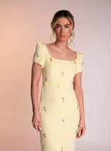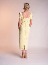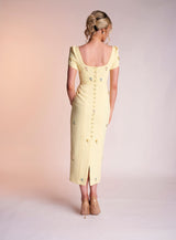 Candy is made with a beautiful light weight crepe lemon. This beautiful scoop neck dress features a straight skirt and matching scoop back with buttons. The dress is covered with symmetrically placed embellishments, each individually hand sewn. This dress is perfect for that special occasion.