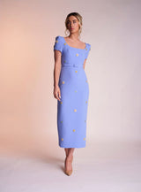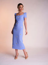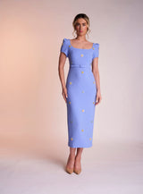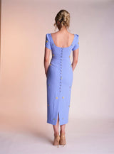 Candy is made with a beautiful heavy weight striking blue crepe. This beautiful scoop neck dress features a straight skirt and matching scoop back with buttons. The dress is covered with symmetrically placed embellishments, each individually hand sewn. This dress is perfect for that special occasion.