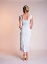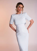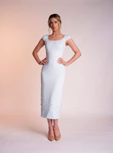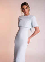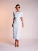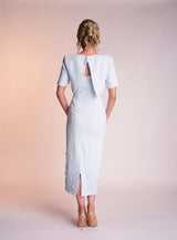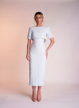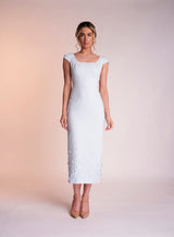 The Delilah dress is made from a beautiful pastel mint light weight crepe. Its scooped neckline with cap sleeves gives the dress a feminine feel. It features a charming satin band below the bust which is still visible when wearing the matching cropped jacket which appears open at the back to see the scoop back. The bottom of the dress is covered in 3D flower appliqués, concentrated at the bottom of the dress and dispersing upwards.