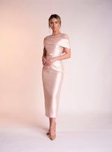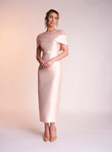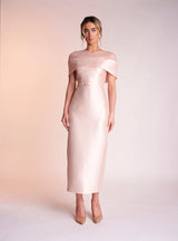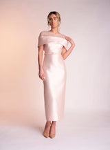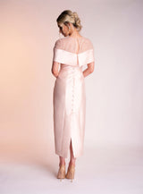 Made from a gorgeous blush silk mikado fabric the Edie dress is lightweight. The mikado material pairs perfectly with the dress' embellished neckline giving the dress a little something special. Edie features a bardot like neckline on top of its fully embellished top and is complimented by its straight skirt and finished with a matching belt and buttons to complete the look.