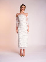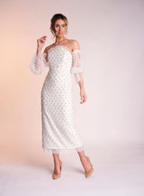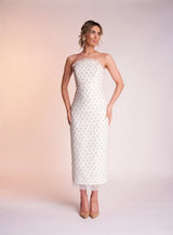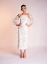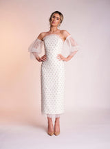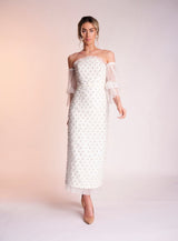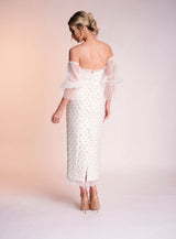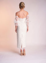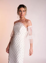 Flossy is a showstopper. This dress is made with a fully pearl embellished fabric overlayed on top of a luxurious ivory crepe. Flossy features a strapless bodice and low back, outlined with a complimentary ivory tulle trim at the bust and hem of its straight skirt. The dress is paired with detached sleeves in that same tulle fabric giving the dress a fun and youthful feel.