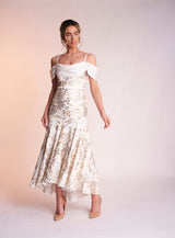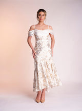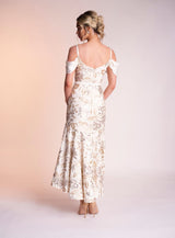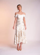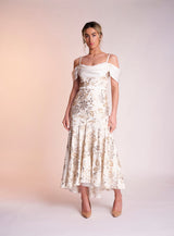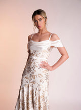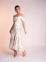 The Gia dress is made from the most beautiful sequin adorned linen fabric, the dress features an ivory satin cowl neck and drape over the upper arm. The rich, warms tones of the fabric and floral print are perfect for the spring summer season. The skirt is fitted over the hips with a dipped peplum hem.