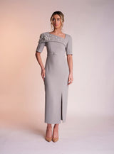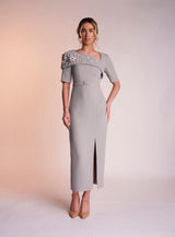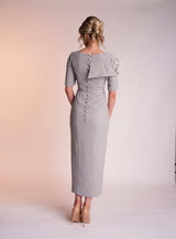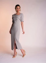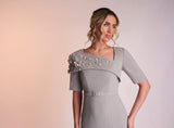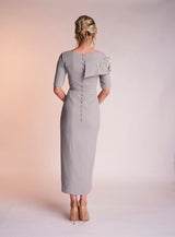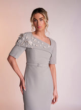 Made from a beautiful heavy weight sage green crepe, the Kate dress exudes elegance. Its angular asymmetrical neckline gives a beautiful structural silhouette which pairs beautifully with the dress' straight skirt. Kate features 3/4 length sleeves with a bardot like feature wrapping around one arm, this feature is adorned with 3D flower appliqués, giving the dress a delicate and feminine feel. Complete with matching belt and buttons, this dress is perfect for that special occasion.