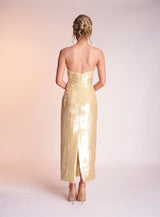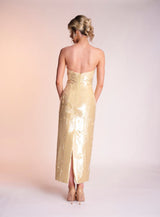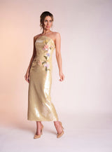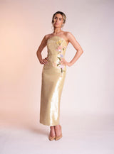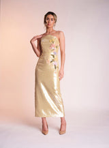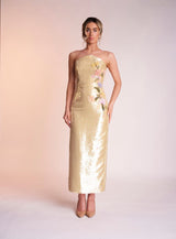 The Penelope dress is truly something special. Made from the most luxurious lemon sequin fabric this dress is sure to turn heads. This dress features a bandeau neckline with a straight skirt and a hand sewn organza floral motif along the side of the dress' bodice leading into the skirt. Perfect for your special occasion this summer.