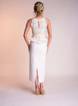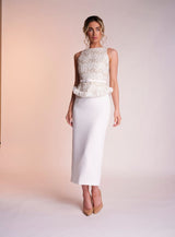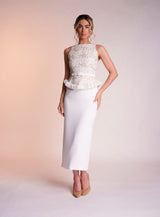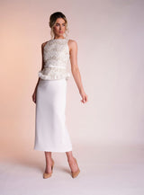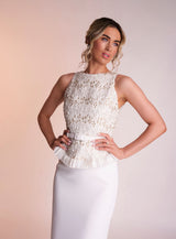 The Victoria dress is made from the most luxurious embellished fabric, meeting a row of unique silk chiffon circles to create a peplum silhouette. complete with an ivory crepe straight skirt and matching belt to finish the look.