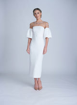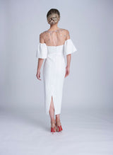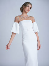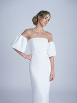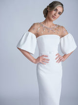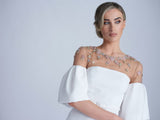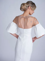 The Charlotte dress is made from a heavy weight ivory crepe. The top of the bodice is a rose gold lace with nude tulle underlay adorned with soft pink, blue and gold floral applique. The beaded detail is so luxurious and perfect for that special occasion. The sleeves are fitted over the shoulder and then puff out in the crepe to finish. The dress is completed with a fabric covered belt and fabric covered buttons.