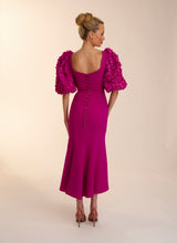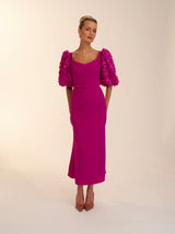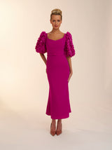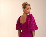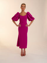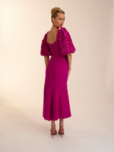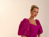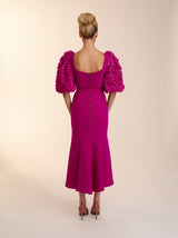 The rose dress is made in this beautiful magenta crepe. With its fit and flare skirt and oversized floral textured sleeves. This dress is the perfect balance of fun and flirty. Complete with gold rimmed buttons down the back Rose is perfect for any special occasion.